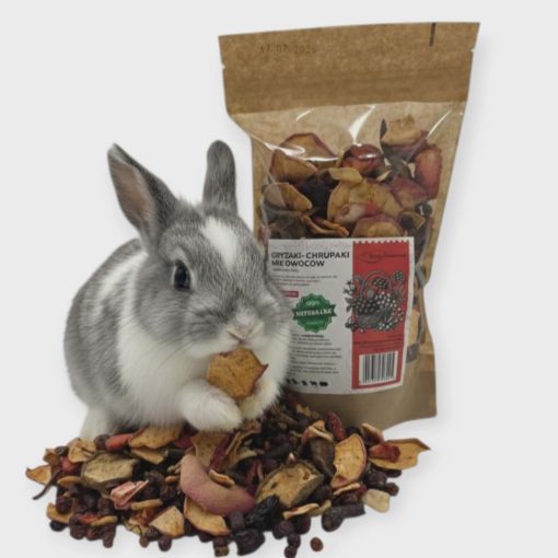 Nasz Mix Owocowy Gryzaki-Chrupaki to starannie skomponowana mieszanka 10 składników, stworzona z myślą o zdrowiu i radości gryzoni oraz królików. To nie tylko pyszna przekąska, ale przede wszystkim bogactwo naturalnych witamin.